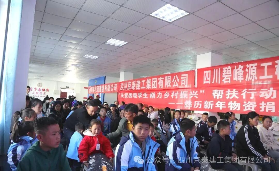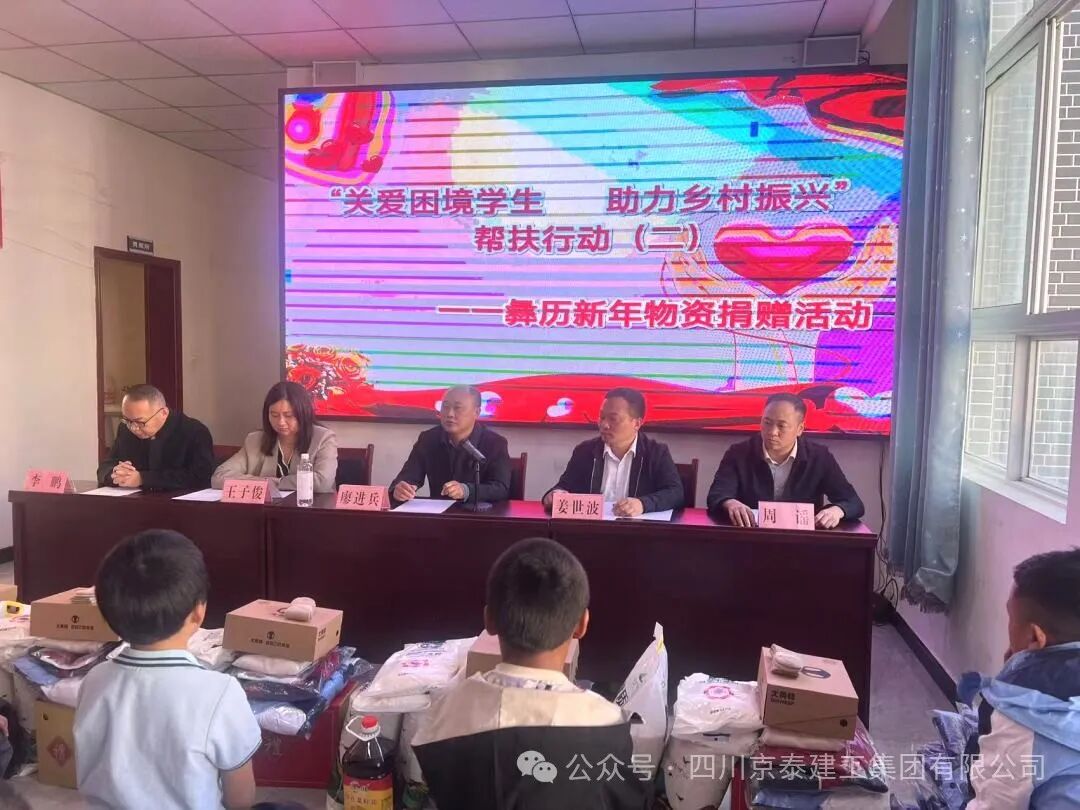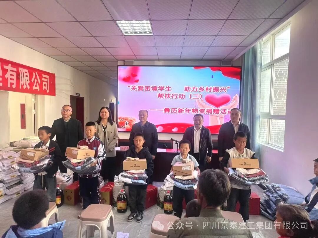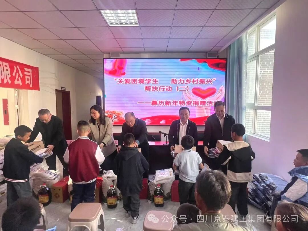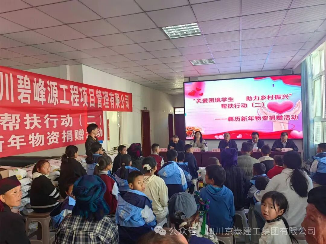 四川京泰建工集团有限公司携手金阳县京蜀建设有限公司、四川碧峰源工程项目管理有限公司以每年不低于五十万的圆梦基金助力的“关爱困境学生,助力乡村振兴”第二次彝族新年物资捐赠活动于2024年11月15日下午在金阳县派来镇光明社区举行。凉山州金阳县县委常委、县纪委书记、监委主任廖进兵,凉山州金阳县派来镇党委书记姜世波,四川京泰建工集团有限公司人力资源部经理崔映蕾,金阳县京蜀建设有限公司总经理周谣,四川碧峰源工程项目管理有限公司总经理王子俊出席本次活动。 凉山州金阳县县委常委、县纪委书记、监委主任廖进兵同志发表讲话,向长期以来关心和支持困境儿童的企业和社会各界表示衷心的感谢和崇高的敬意!讲话中指出此次活动不仅是物质上的帮助,更是一种精神上的鼓舞,让我们看到了乡村振兴的美好前景,社会爱心企业的善举缓解了贫困学生们的燃眉之急,更为他们的未来点燃了希望之光,同时也为高质量发展金阳注入强劲的力量! 捐赠活动现场,气氛热烈而温馨。由四川京泰建工集团有限公司、金阳县京蜀建设有限公司、四川碧峰源工程项目管理有限公司员工代表及派来镇工作人员为117位困境学生们发放彝族年帮扶活动的物资,孩子们收到物资时,脸上不自觉的洋溢着惊喜和感动的笑容! 最后我们希望每一位同学都在自己的道路上不懈探索、努力前行。愿在此与大家共同探讨和分享我们的期待,用一份心、燃起千份希望、点亮前行的路;希望每一个同学能充分发挥自身的潜力,展现出独特的光彩,树立正确的价值观和人生观;希望你们立鸿鹄之志,怀桑梓之念,不忘党和政府的深情关怀,不忘大家的关爱,把感恩之心化为不竭的动力和实际行动,用满腔的热忱和过硬的本领回报金阳,回馈社会。
